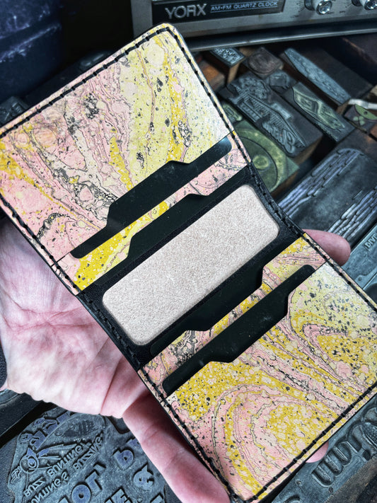 (Only 1) Handmade 6 Pocket Grateful Dead Marbled Pink/Yellow Leather Bifold Minimalist Wallet