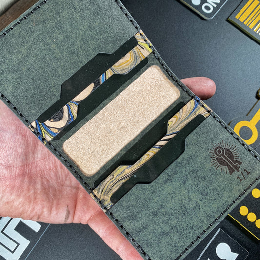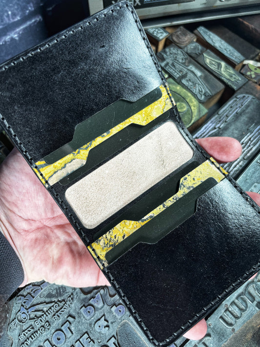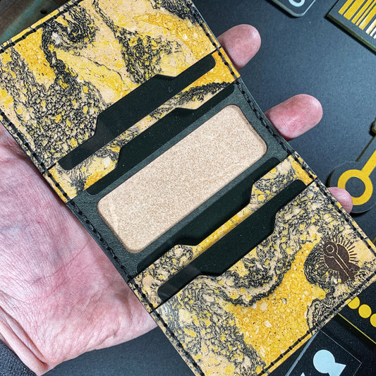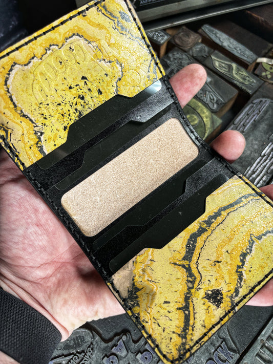 (Only 1) Handmade 6 Pocket Grateful Dead Marbled Yellow/Black Leather Bifold Minimalist Wallet
