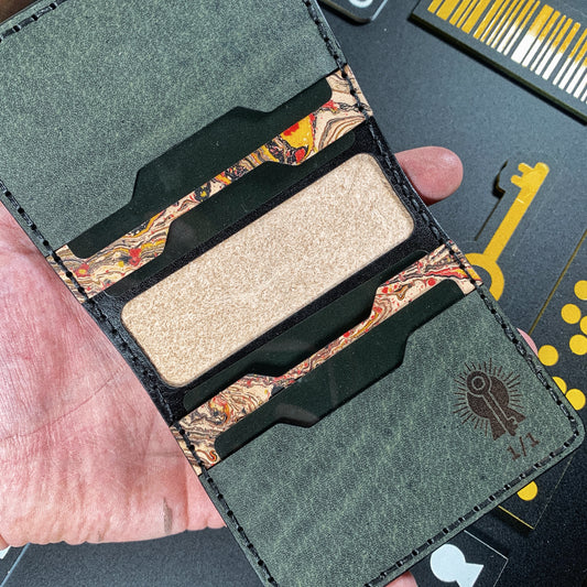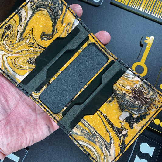 (Only 1) Handmade 6 Pocket Grateful Dead Marbled Yellow/Black Leather Bifold Minimalist Wallet
