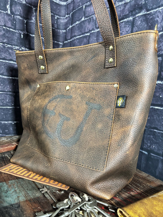 Lost Cowboy Skeleton Brown Pebbled Handmade Leather Tote Bag
