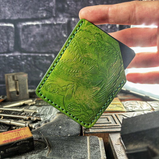 Metallic Green T Rex Dinosaur Embossed Hand Made Leather Minimalist Wallet
