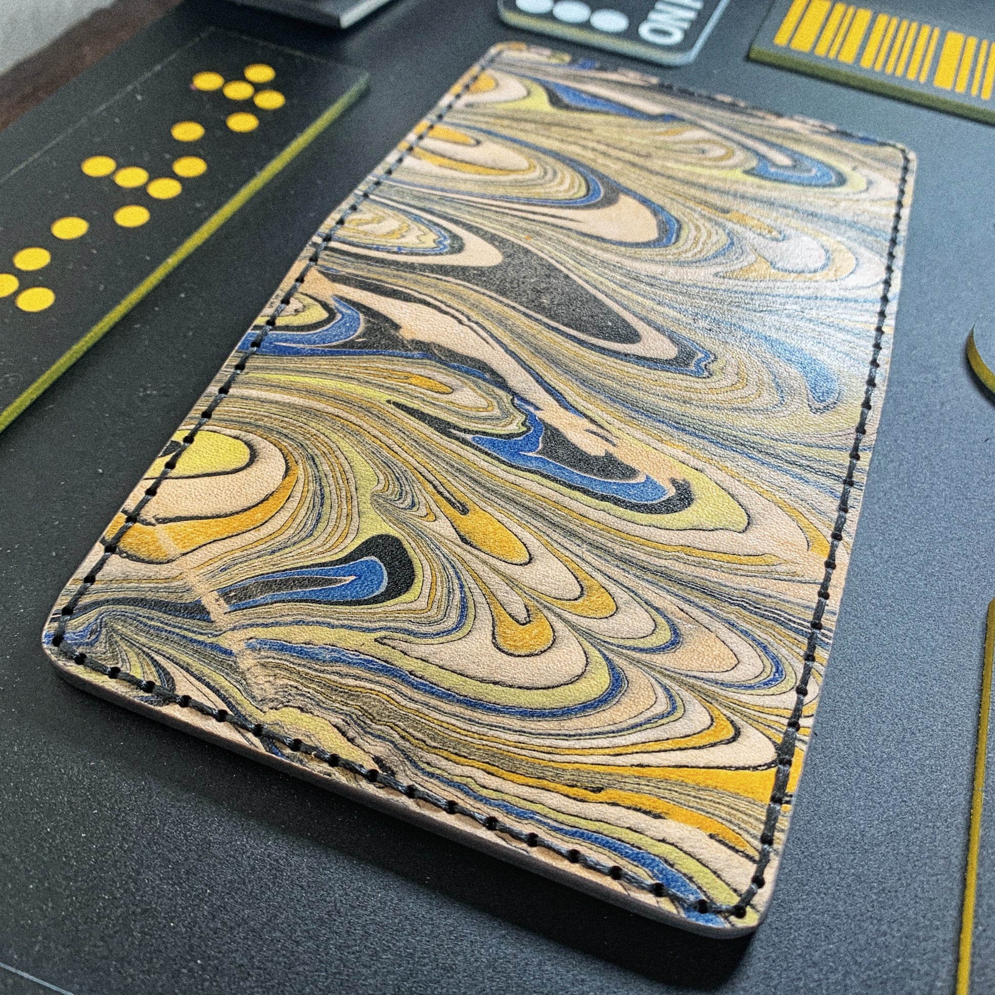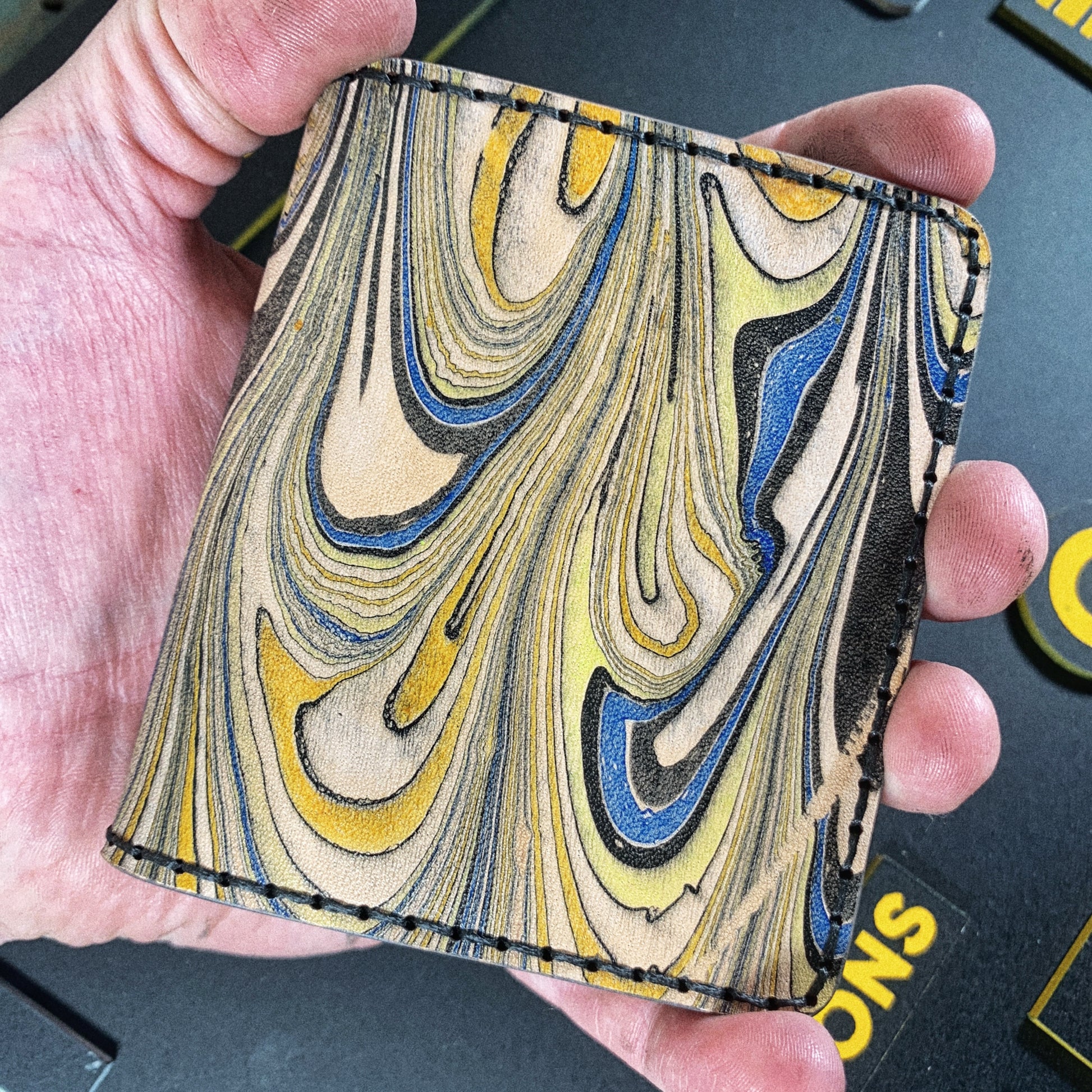 This is a one off handmade marbled leather bifold wallet. It has a hand dripped marbled outside with accent pockets on the inside. Because of the hand-dipped marbling it is impossible to make the same wallet twice. So if your are someone that looks to have something that nobody else has...this is for you!