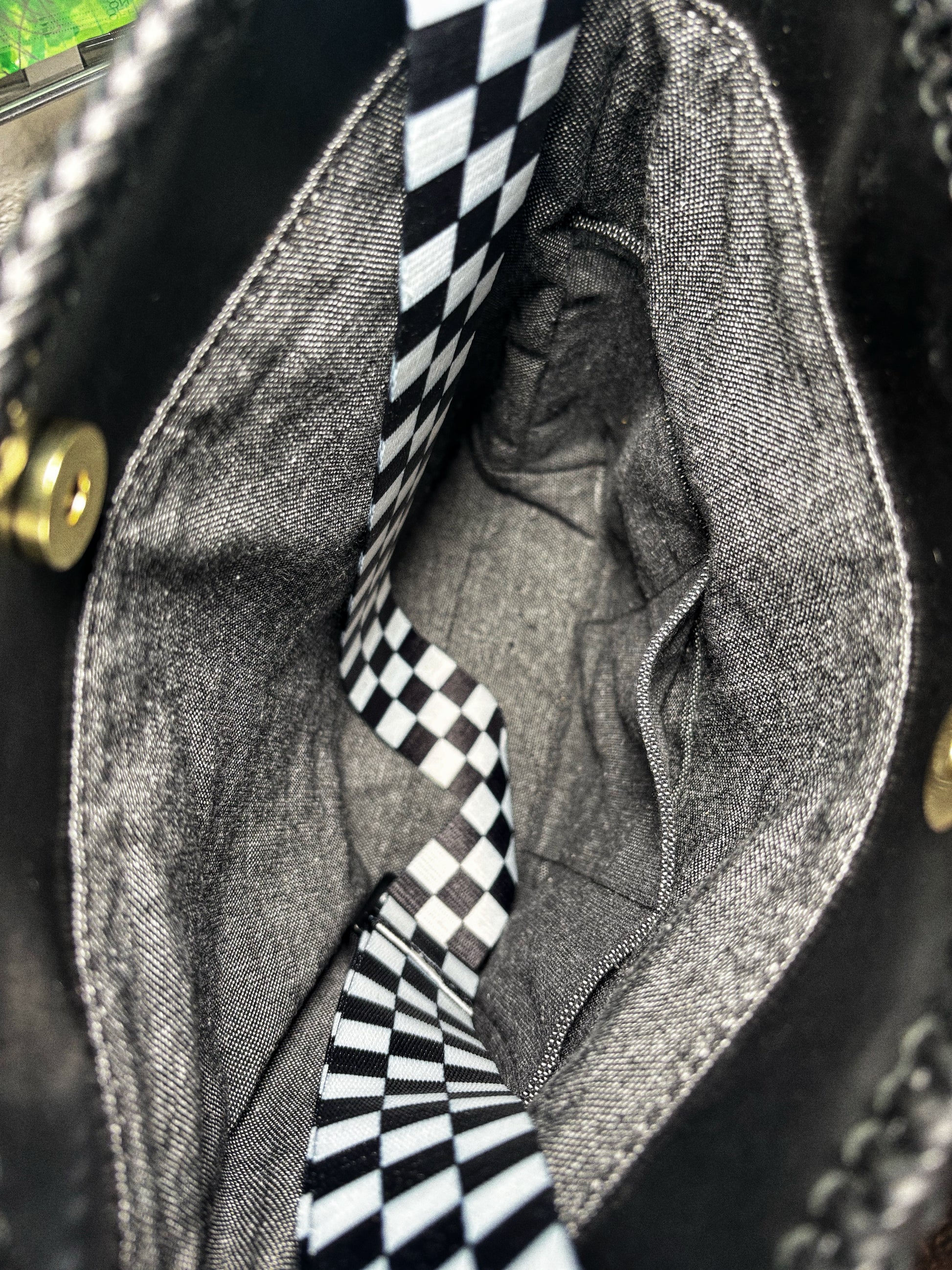 Made from black leather with an engraved graphic of a dripping dagger through a heart, with the word LOST in the center. Rim of the bag is double loop laced by hand.
